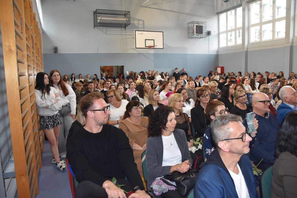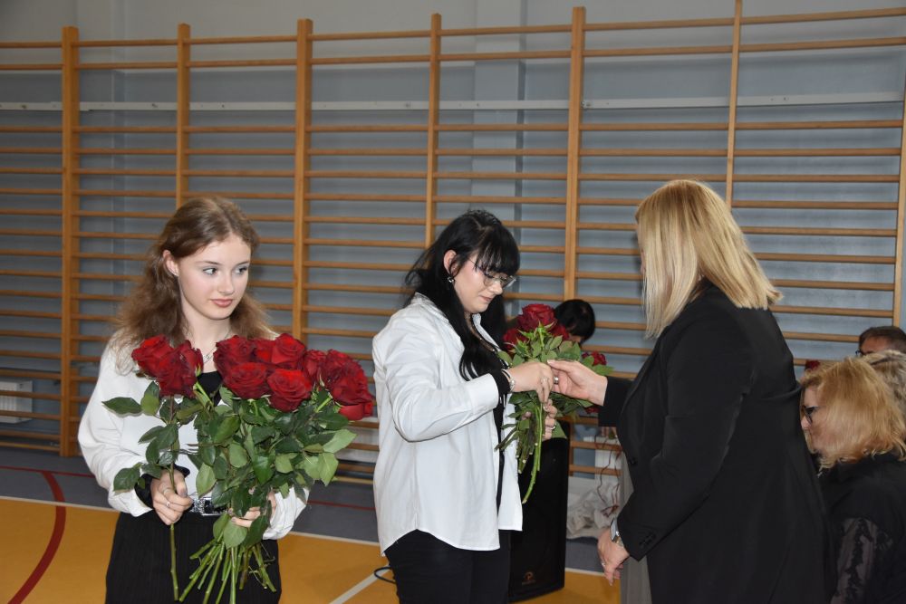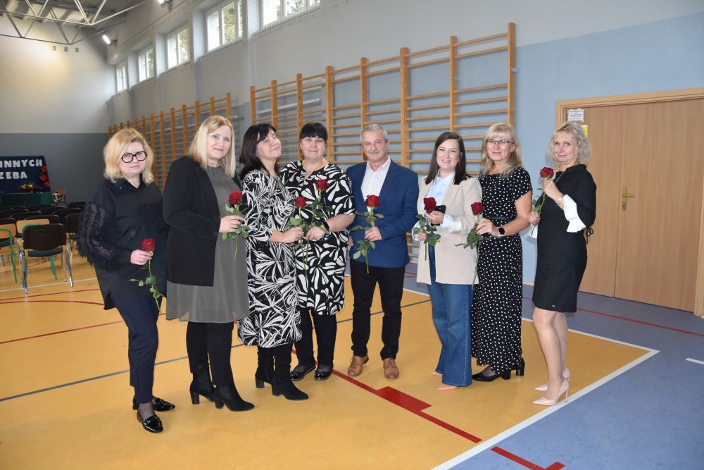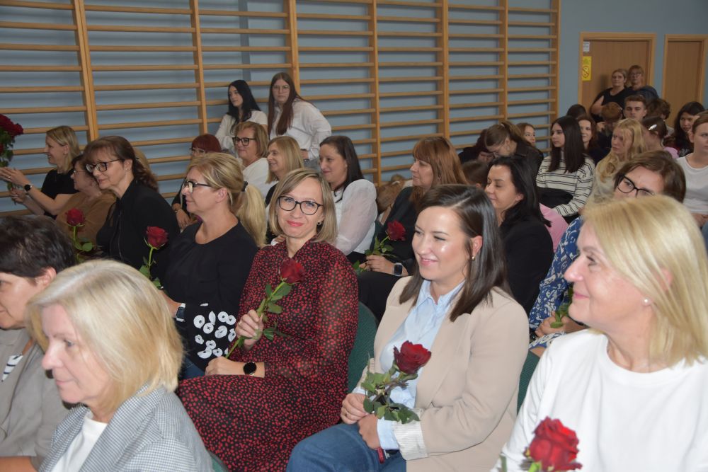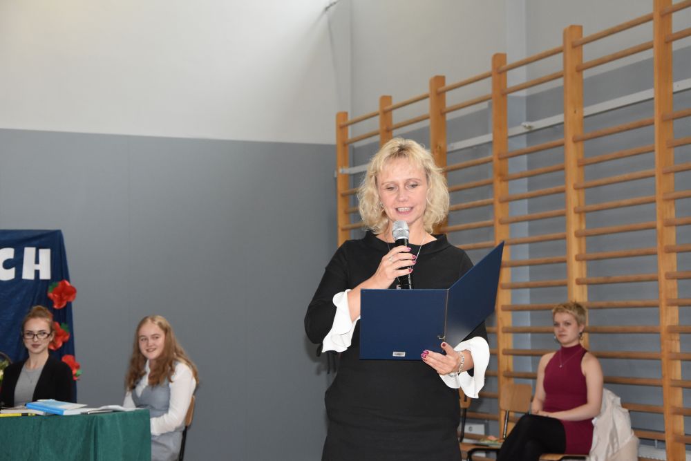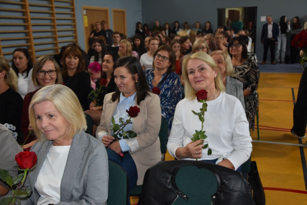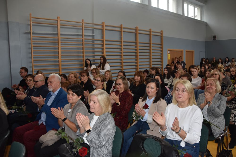 Głos zabrała także pani Dyrektor, która w swoim przemówieniu podkreśliła rolę nauczycieli w kształtowaniu postaw i wartości młodych ludzi. Uczącym złożyła życzenia wielu sukcesów zawodowych i osobistych.