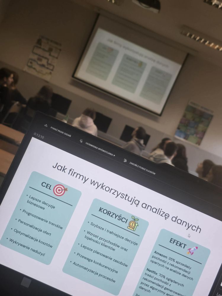 Podczas spotkania uczniowie 4 klasy technika ekonomisty poznali praktyczne zastosowania analizy danych w firmach i korporacjach. Dowiedzieli się, jak działają nowoczesne narzędzia analityczne oraz w jaki sposób dane wspierają podejmowanie kluczowych decyzji biznesowych.