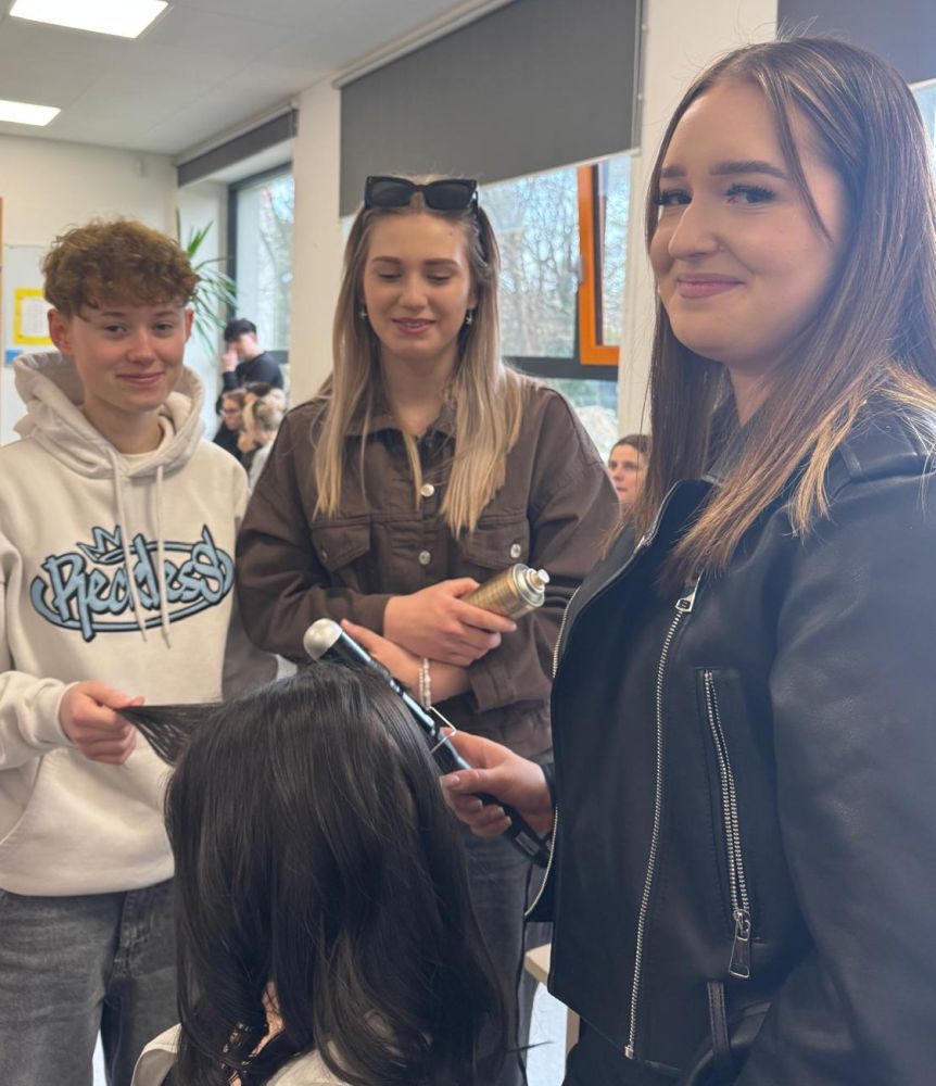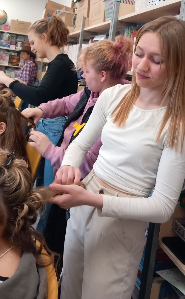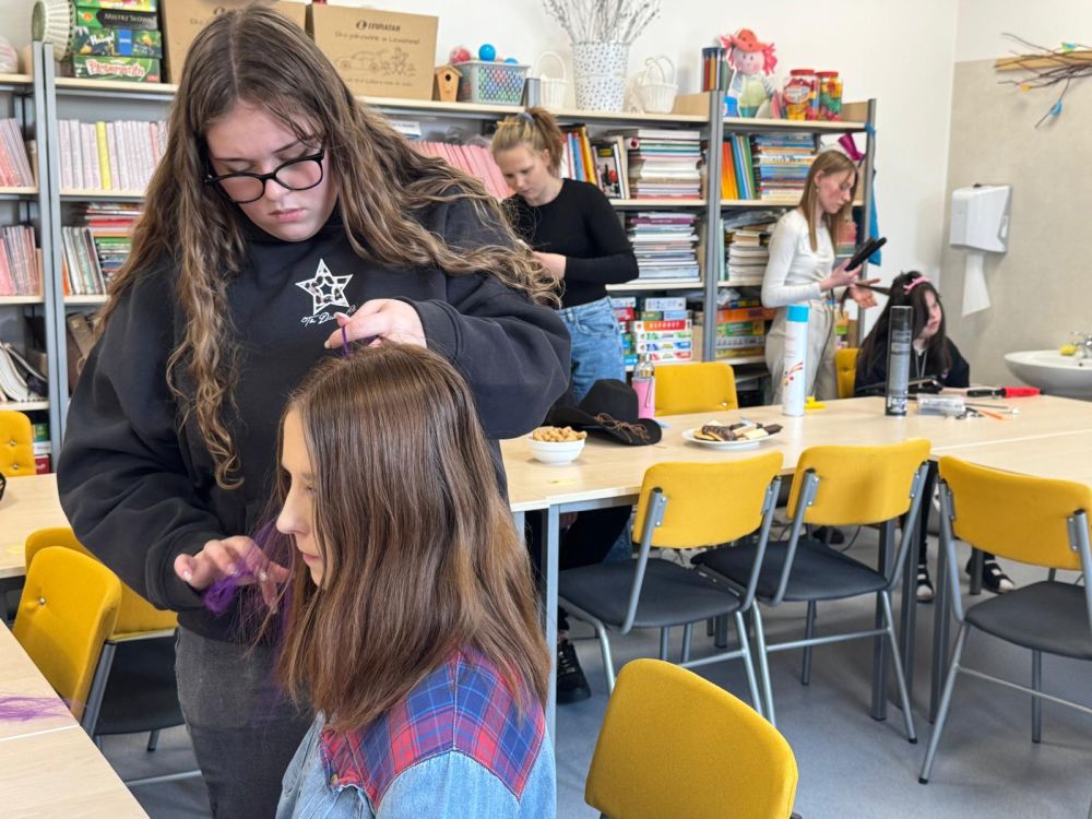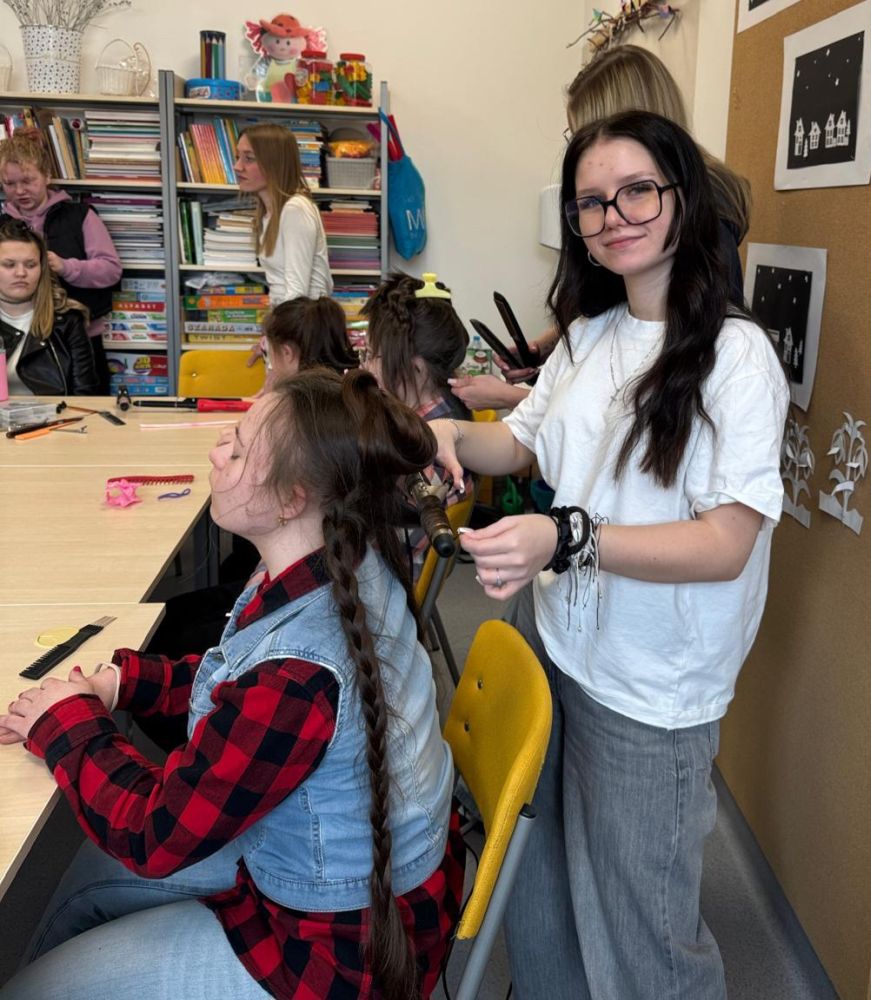Młodzi adepci fryzjerstwa, pełni energii i zapału, wykonywali różnorodne fryzury i stylizacje, dbając przede wszystkim o piękny wygląd, ale i dobre samopoczucie uczennic. Spotkanie przebiegało w bardzo miłej i radosnej atmosferze, której towarzyszyły uśmiechy i wiele wzajemnej sympatii.